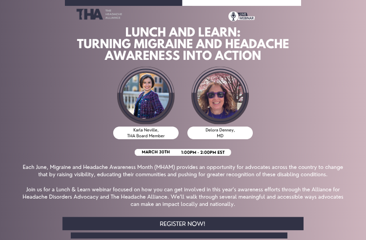 The Lunch & Learn series is free to attend, and registration is open to anyone interested in learning more about headache disorders and advocacy. Check out our Get Involved page for more information on how to attend.
